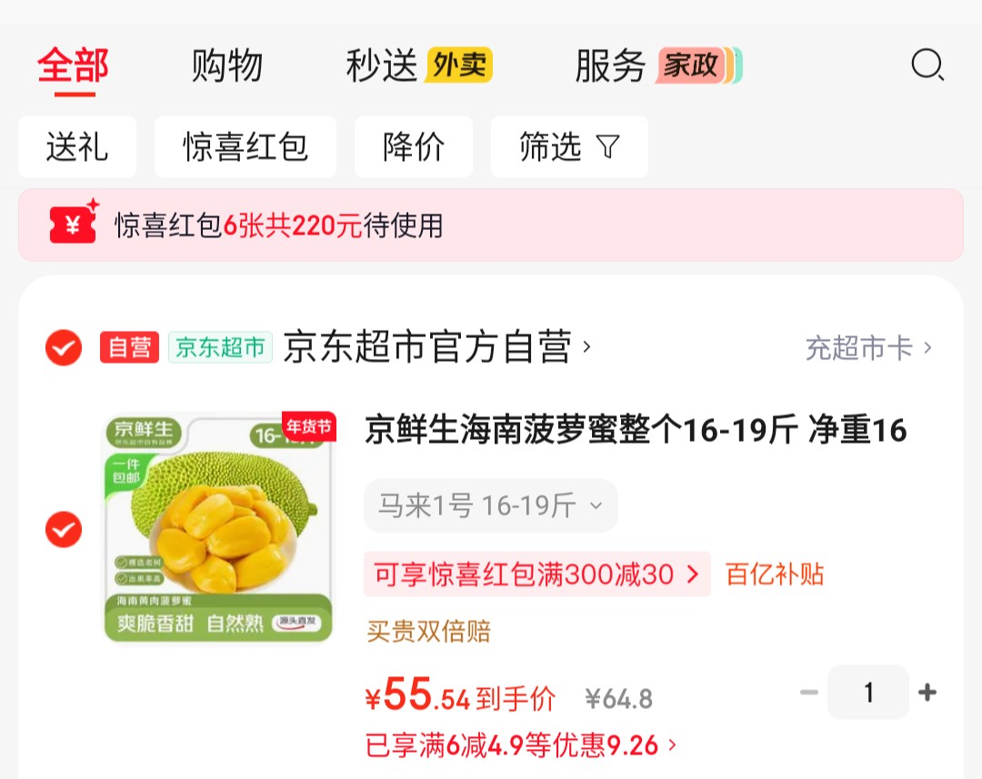 京鲜生 海南菠萝蜜整个16-19斤【59.9】