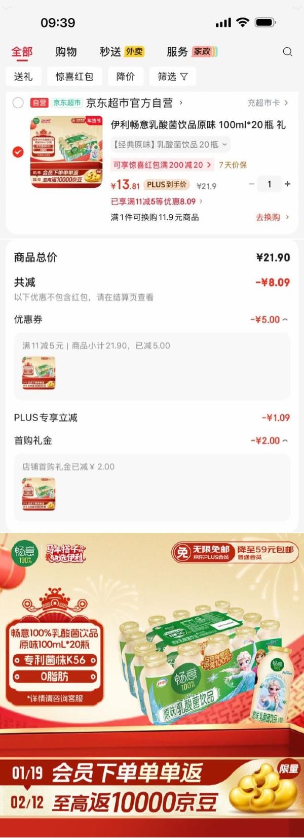 伊利畅意乳酸菌饮品原味 100ml*20瓶 礼盒装