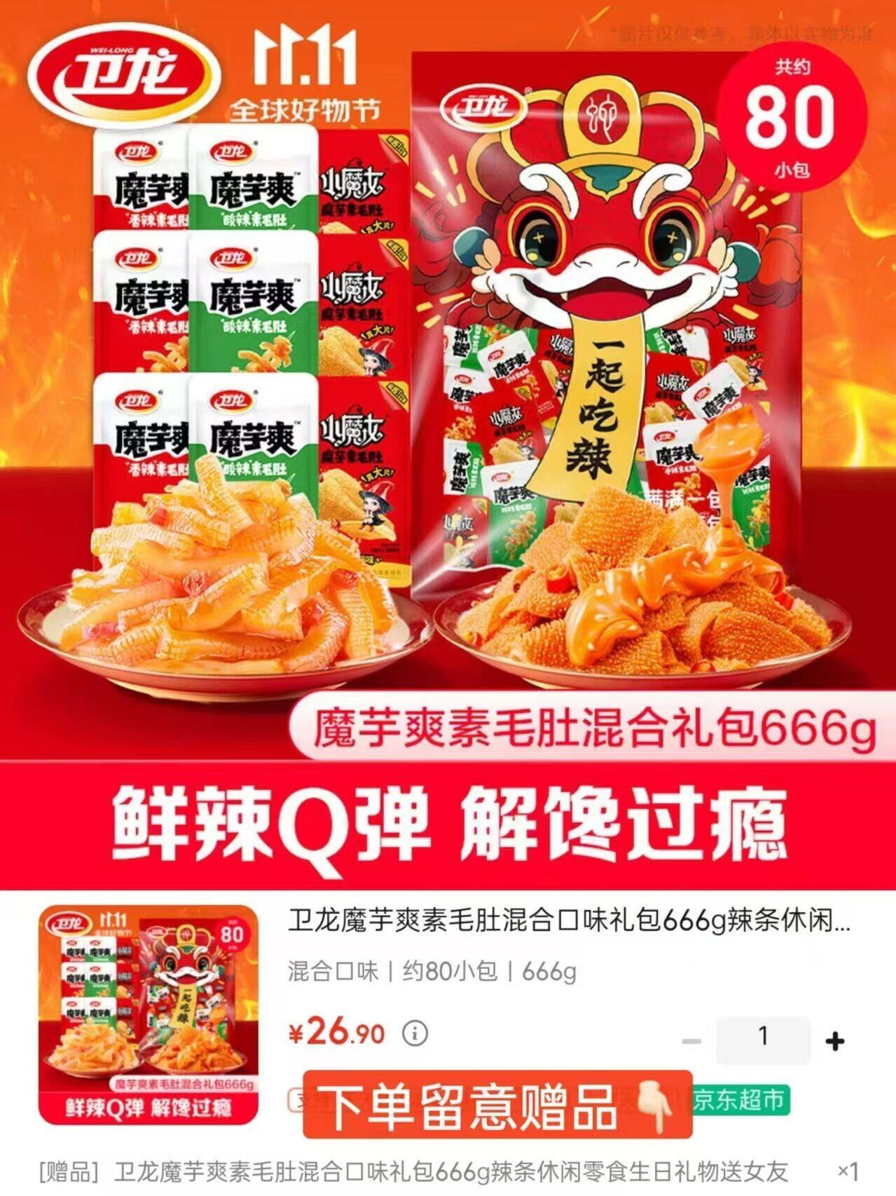快卫龙买1送1 自营 卫龙 魔芋爽素毛肚666g 26.9亓包邮,赠同款礼包666g好单发报员2026年02月06日 13:250举报 ——快卫龙买1送1——【自营】卫龙 魔芋爽素毛肚666ghttps://u.jd.com/JD5zT9r26.9亓包邮,赠同款礼包666g*才13.4/件 鲜辣Q弹 解馋过瘾复制文案