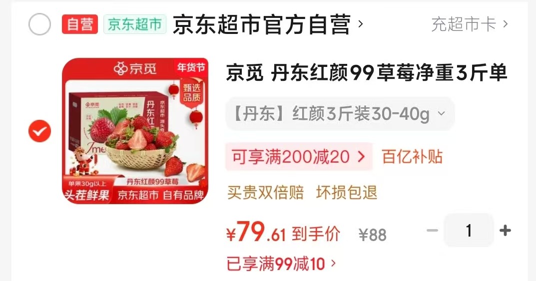 京觅 丹东红颜 99草莓净重3斤 单果30克起 ,凑后【79】