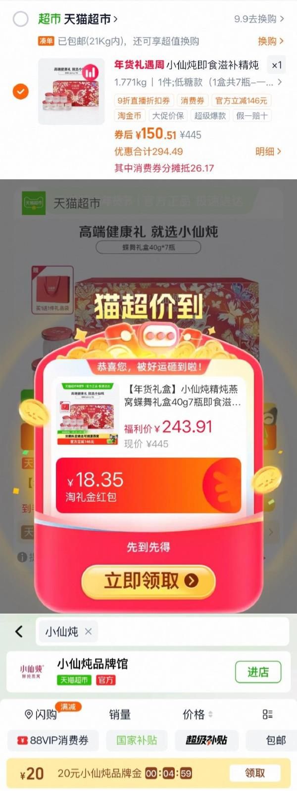 ①超市首页搜索“小仙炖”,部分有20品牌金