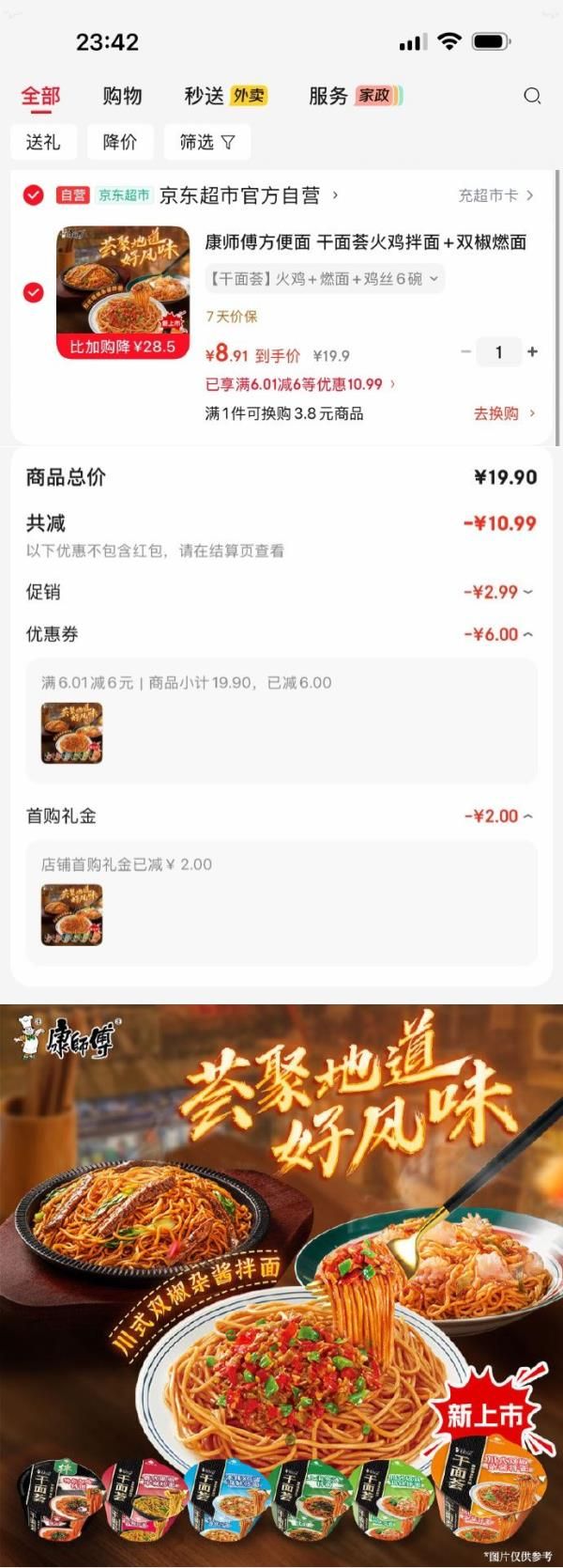 康师傅方便面 干面荟火鸡拌面 双椒燃面 鸡丝拌面134g*6盒,砸6券2首单【8.91】