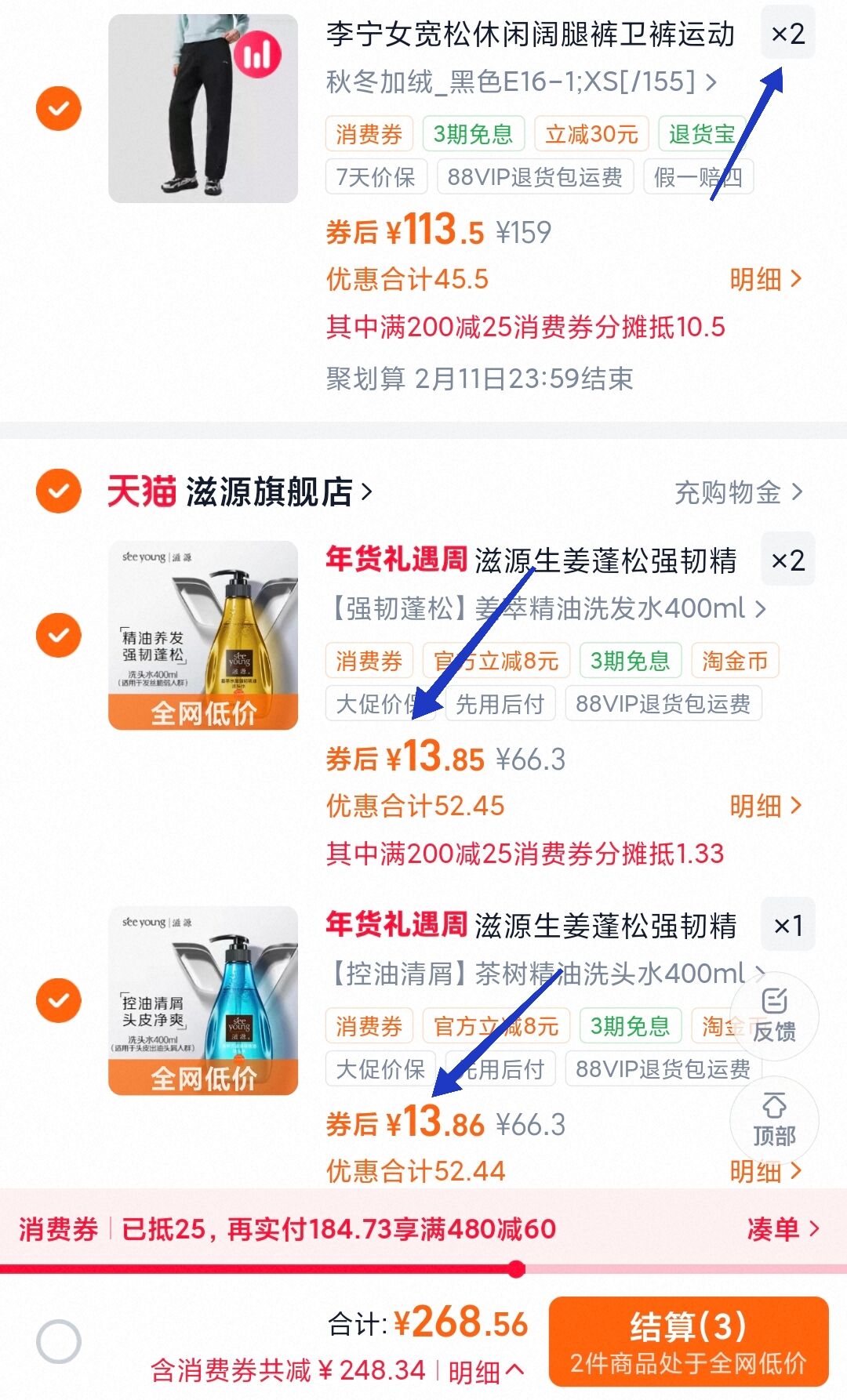 ③凑单裤子加购 复制本消息打开桃宝查看 根据消费券大小提高凑单件数 好单发报员 2026年02月08日 09:02 0 举报 ③凑单裤子加购https://m.tb.cn/h.7uDgaEe复制本消息打开桃宝查看根据消费券大小提高凑单件数直到显示凑满消费券滋源洗发水3瓶 39亓左右!划13亓一瓶 超级好忦 复制文案