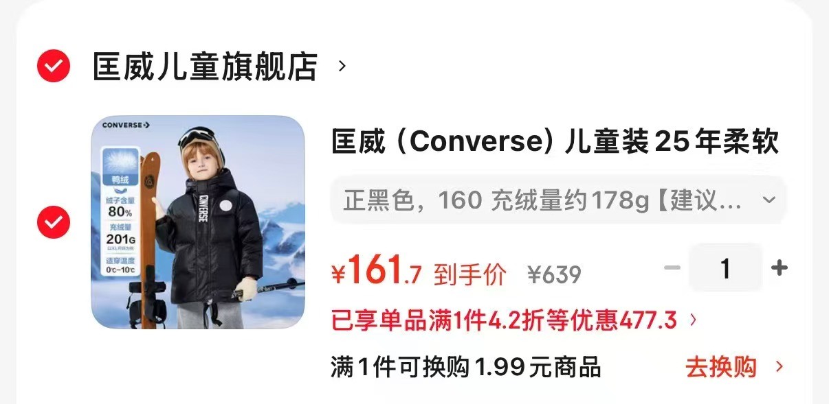 匡威 (Converse)儿童 短款加厚连帽羽绒服 充绒量约178g,凑后【161.7】