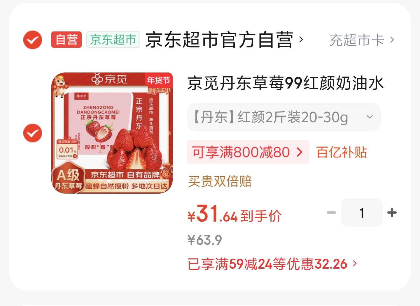 自营 丹东红颜99草莓2斤【31.6】元