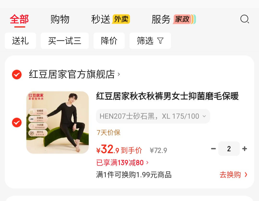 红豆 居家秋衣秋裤男女士抑菌磨毛保暖内衣,任选2件【65.8】