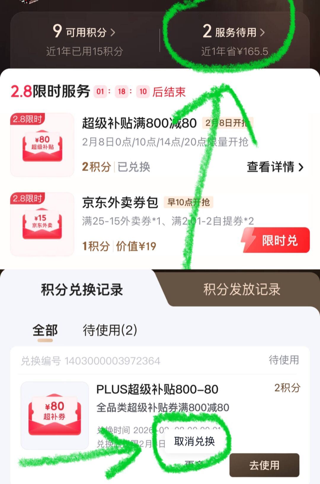 (如图,取消兑换即可,2积分会退回来的)