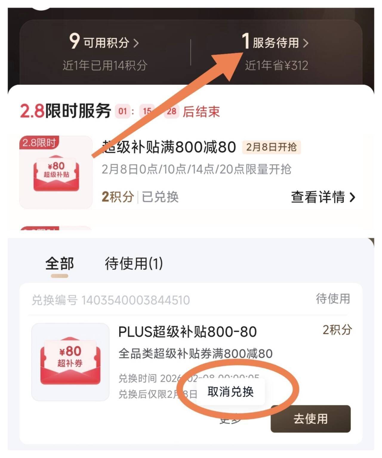 Plus兑的800-80全品,凌晨2点过期!用不到记得退掉 (如图所示,取消兑换即可,会返还2积分)