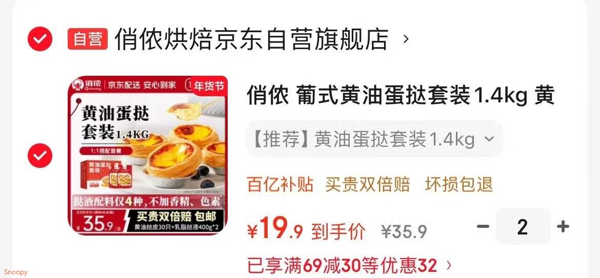 领69-30 俏侬 葡式黄油蛋挞套装1.4kg 黄油挞皮30只 挞液*2 ,拍2件 折19.9/件 好单发报员 2026年02月09日 00:07 0 举报 领69-30 https://u.jd.com/laKyhsF 俏侬 葡式黄油蛋挞套装1.4kg 黄油挞皮30只 挞液*2 ,拍2件 折19.9/件https://u.jd.com/laK3TQf 复制文案