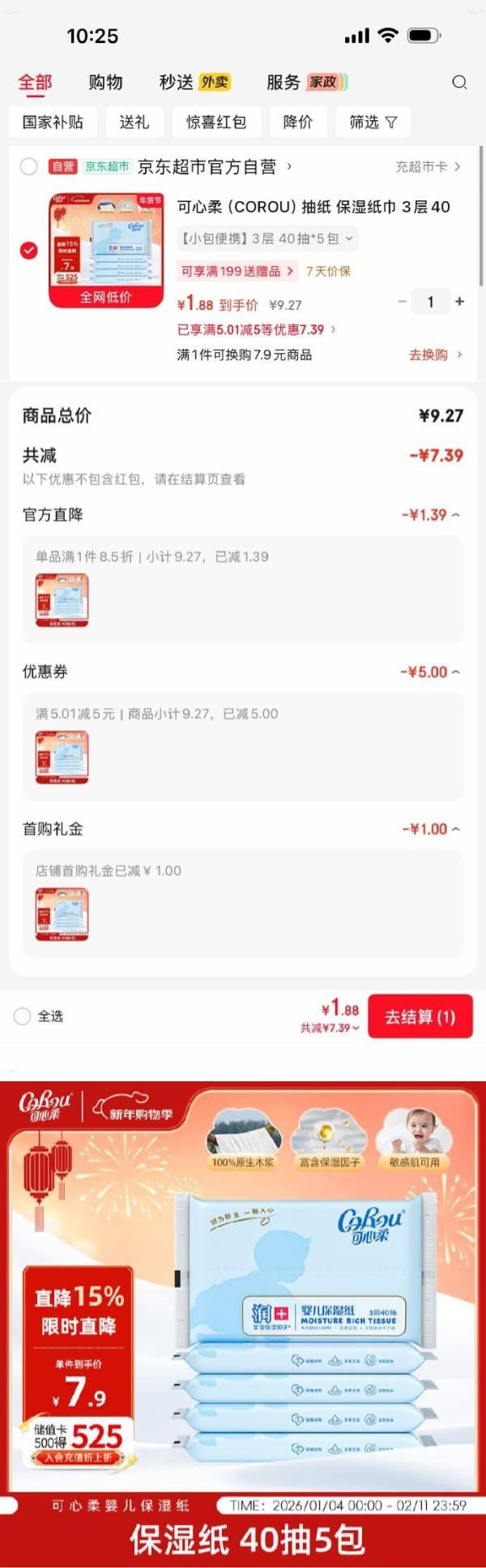 可心柔 抽纸 保湿纸3层40抽*5包S码,1首单【1.88】
