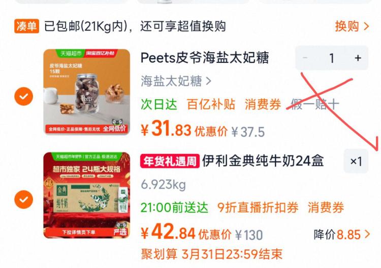 4.最后一步 凑単商品1件 超级补贴页面加购才对 金典纯牛奶24盒仅42元.8 好单发报员 2026年02月09日 10:45 0 举报 4.最后一步 凑単商品1件(超级补贴页面加购才对)https://m.tb.cn/h.7F31i1y金典纯牛奶24盒仅42元.8 复制文案