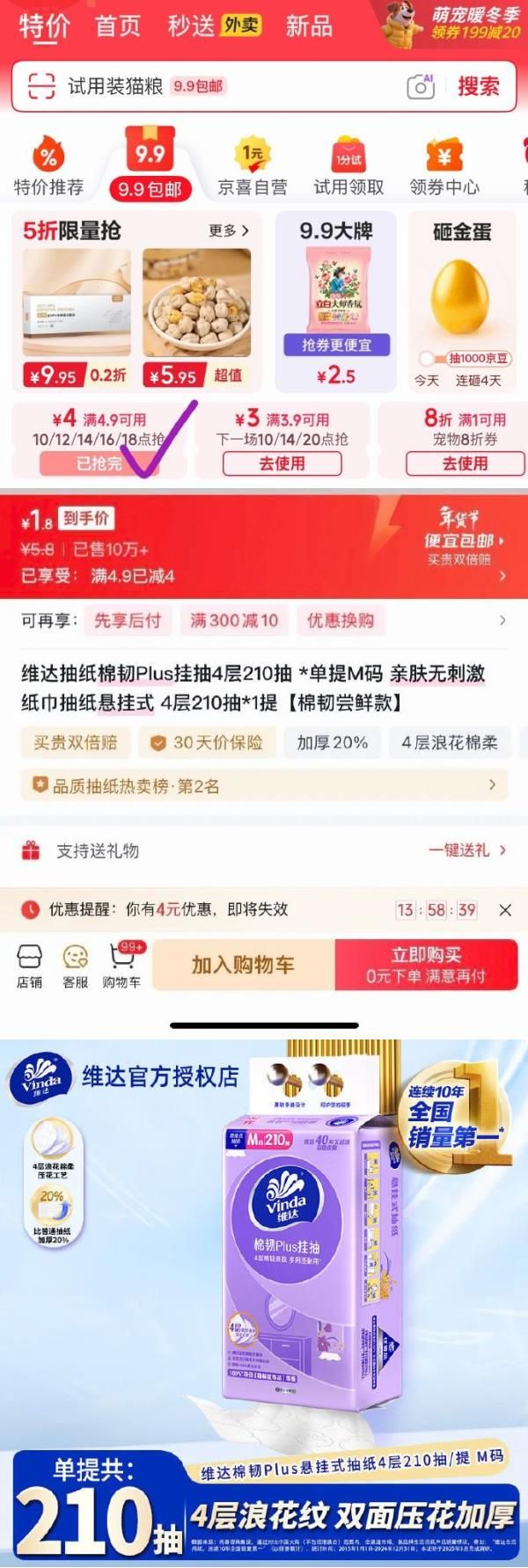 app首页-9.9包邮-有领4.9-4券,比如买: