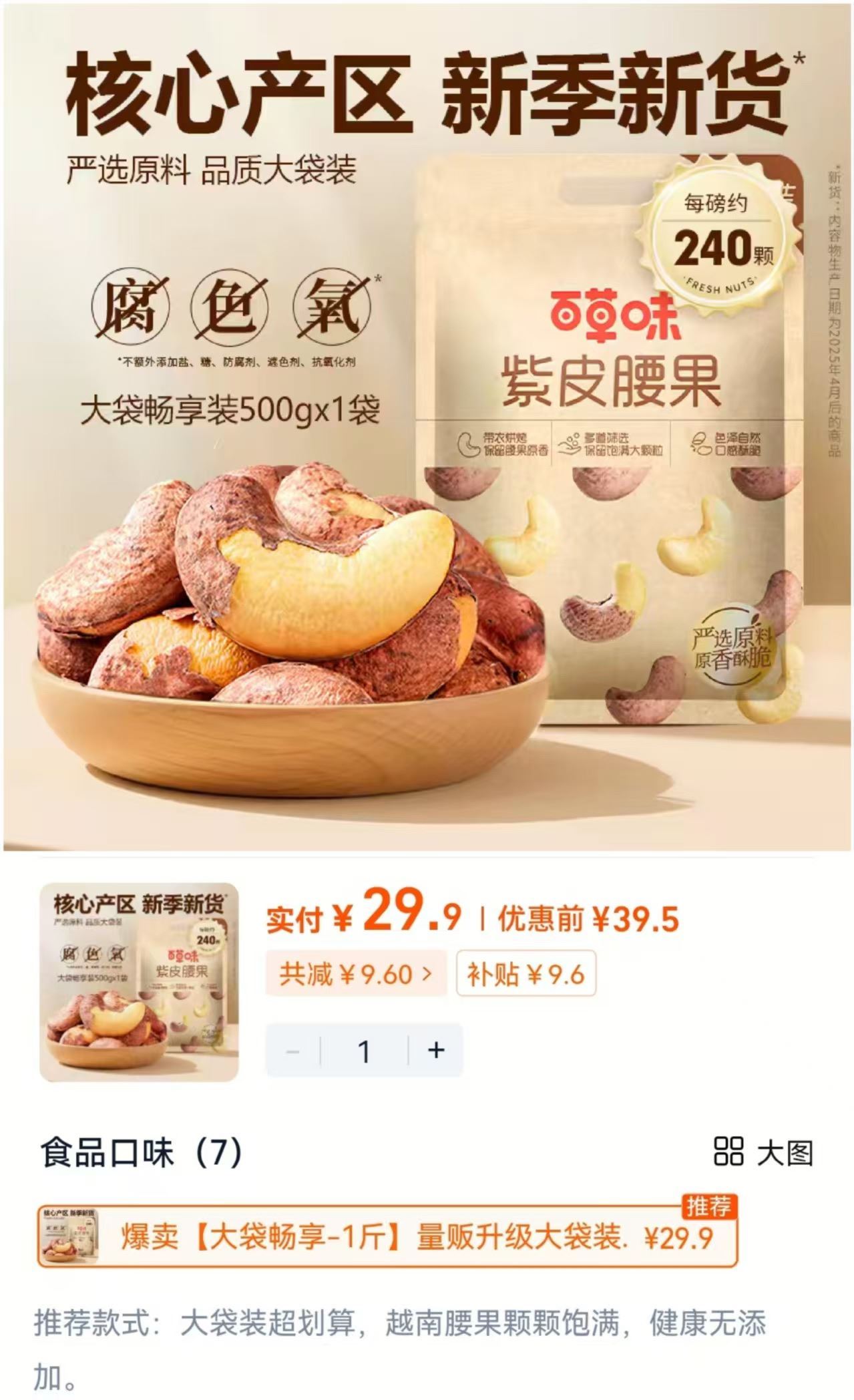百草味紫皮腰果500g 拍大袋畅享1斤装29元.9亓 每天一小把补充人体所需 好单发报员 2026年02月09日 13:41 0 举报 百草味紫皮腰果500g拍大袋畅享1斤装29元.9亓每天一小把补充人体所需颗颗饱满酥脆越嚼越香!!-https://m.tb.cn/h.7FF7E0T 复制文案