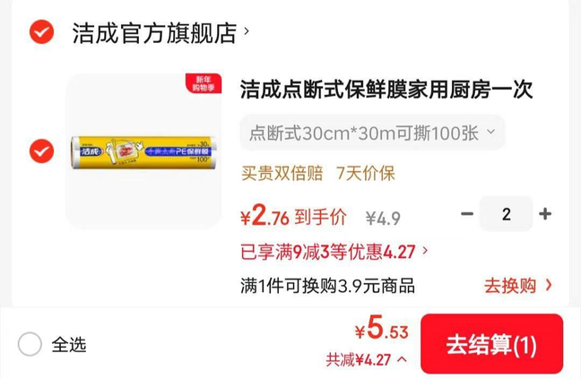 拍2件共5.53元! 洁成 点断式保鲜膜30cm*30m可撕100张 食品级材质 好价包邮~好单发报员2026年02月09日 14:470举报 拍2件共5.53元!洁成 点断式保鲜膜30cm*30m可撕100张https://u.jd.com/laIwOB6 食品级材质 好价包邮~复制文案