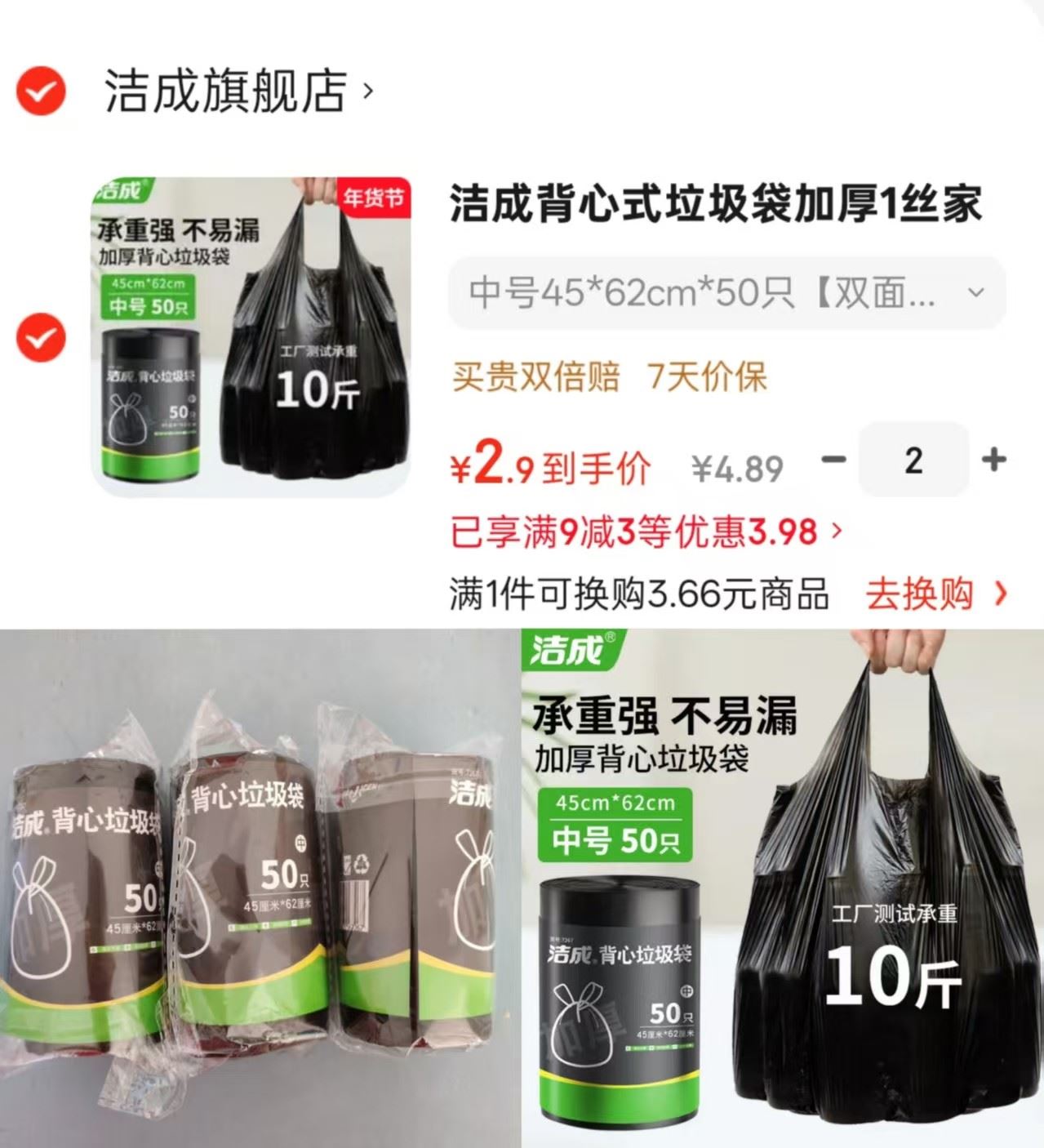 洁成 背心式垃圾袋加厚 双面2丝 45*62cm*50只,拍2件【5.8】