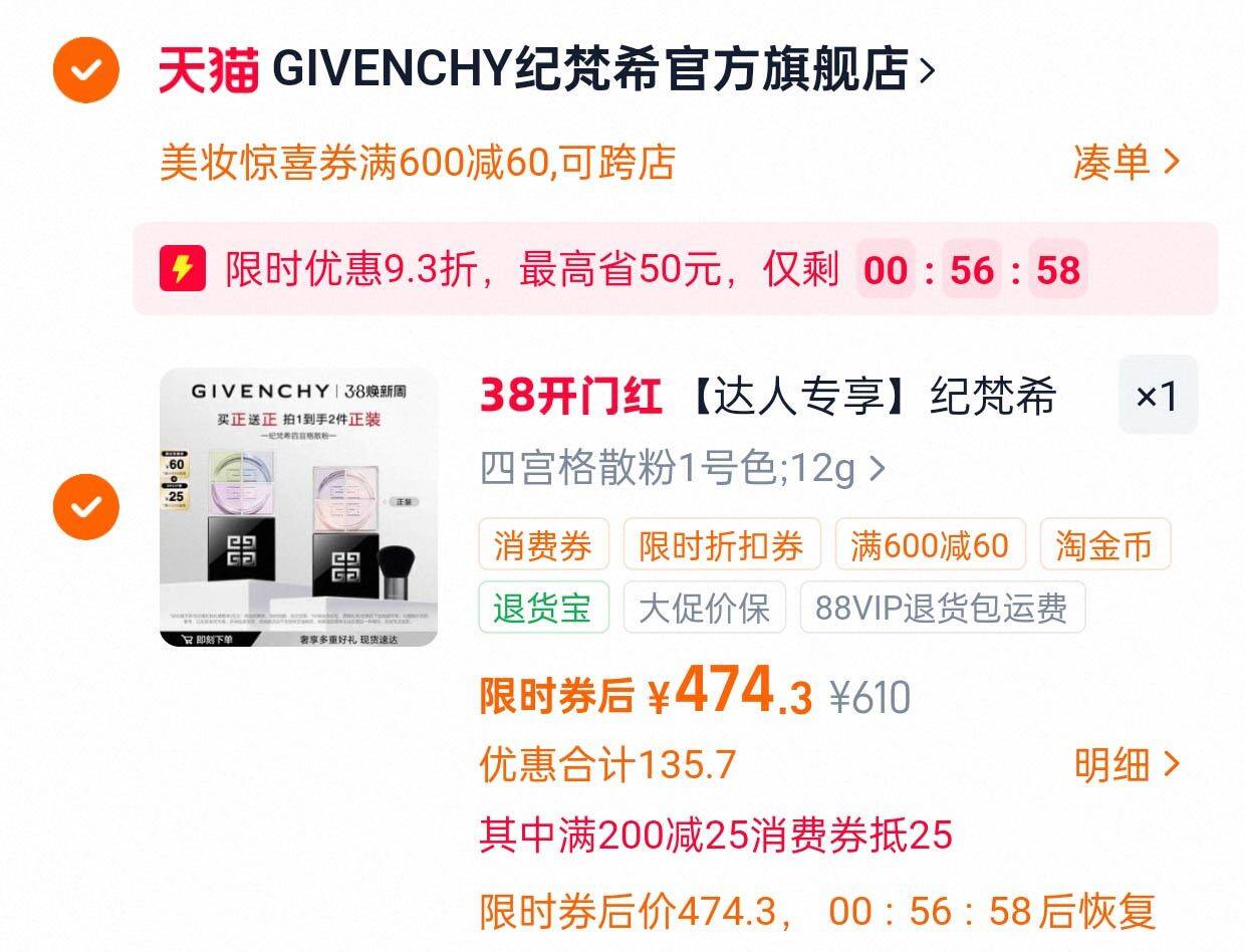 3.凑单商品 加车1件 一起付款 再退款凑单商品 纪梵希四宫格散粉 付474元