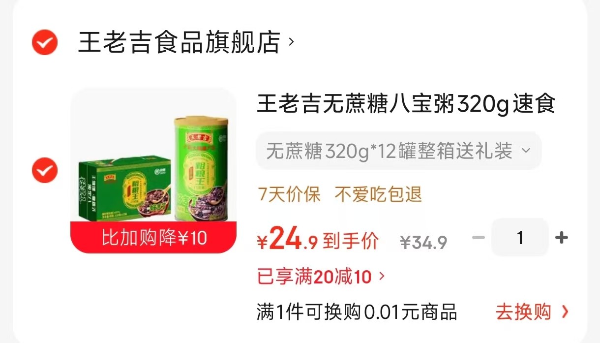 方便速食20-10 王老吉 无蔗糖八宝粥320g*12罐整箱送礼装 24.9 百草味 坚果 零食礼盒2028g/20件 69