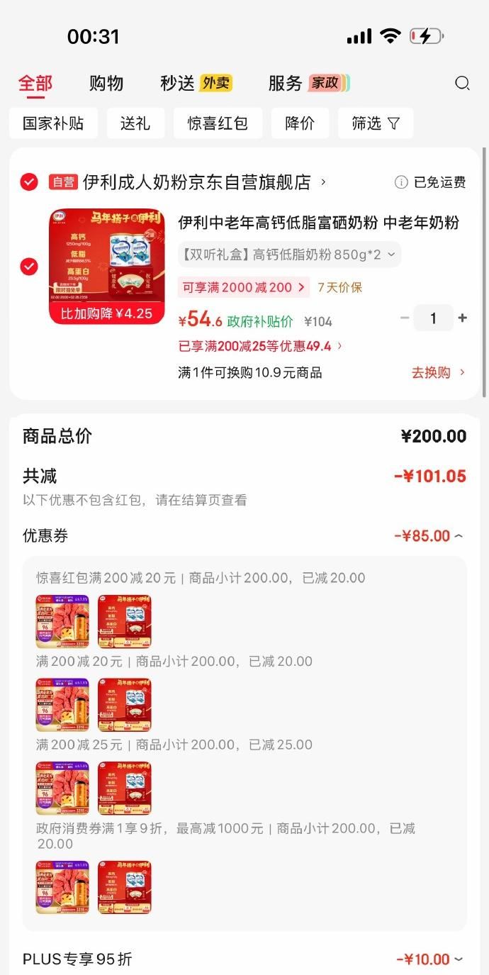 伊利中老年高钙低脂富硒奶粉礼盒850g*2