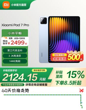 8折 小米平板7Pro 11.2英寸平板电脑 小米Pad 7Pro 3.2K超清屏 144Hz高刷第三代骁龙8s 澎湃OS办公游戏平板 天际蓝 8GB 256GB 官方标配 ---- 普遍有货 | 下1件最优