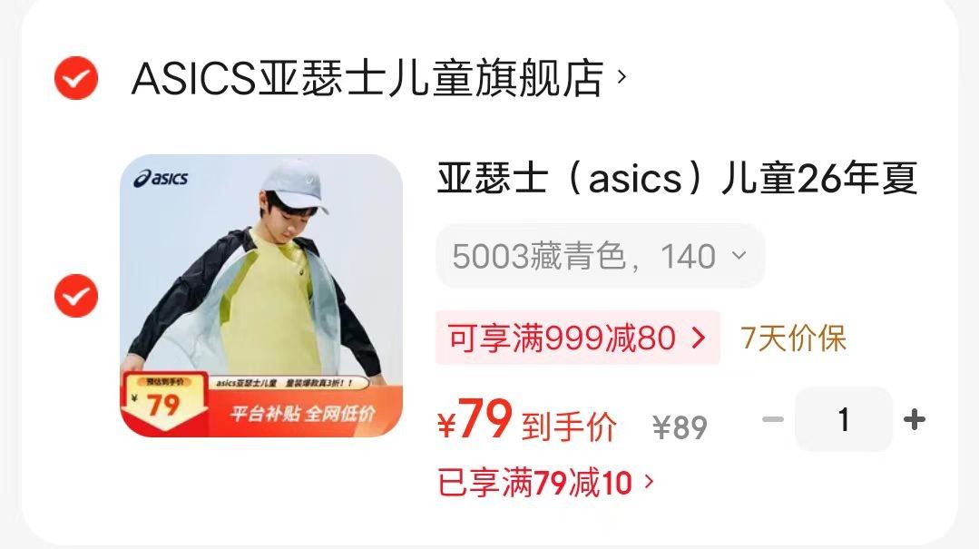亚瑟士 (asics)儿童26年夏季UPF50 轻量凉感防晒服【79】