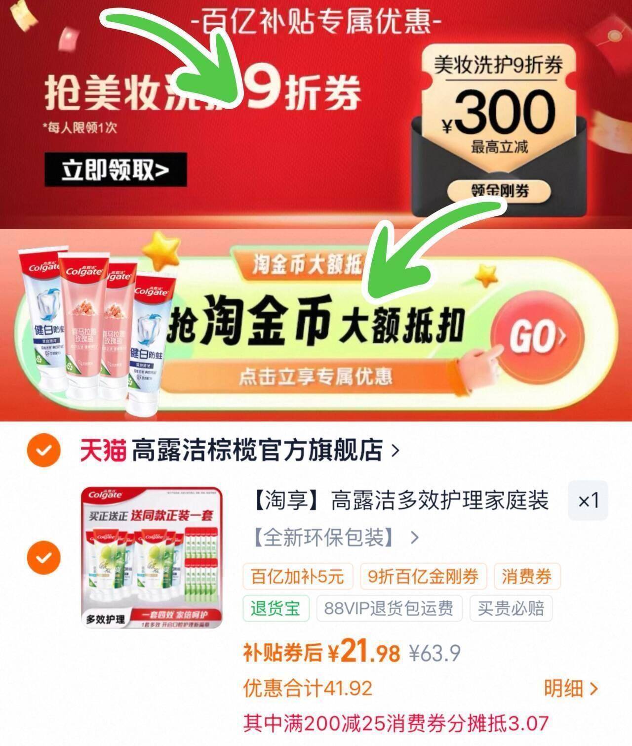 高露洁多效护理家庭装,下拉详情页先领9折金刚券,再叠淘金币买一送一两套到手25