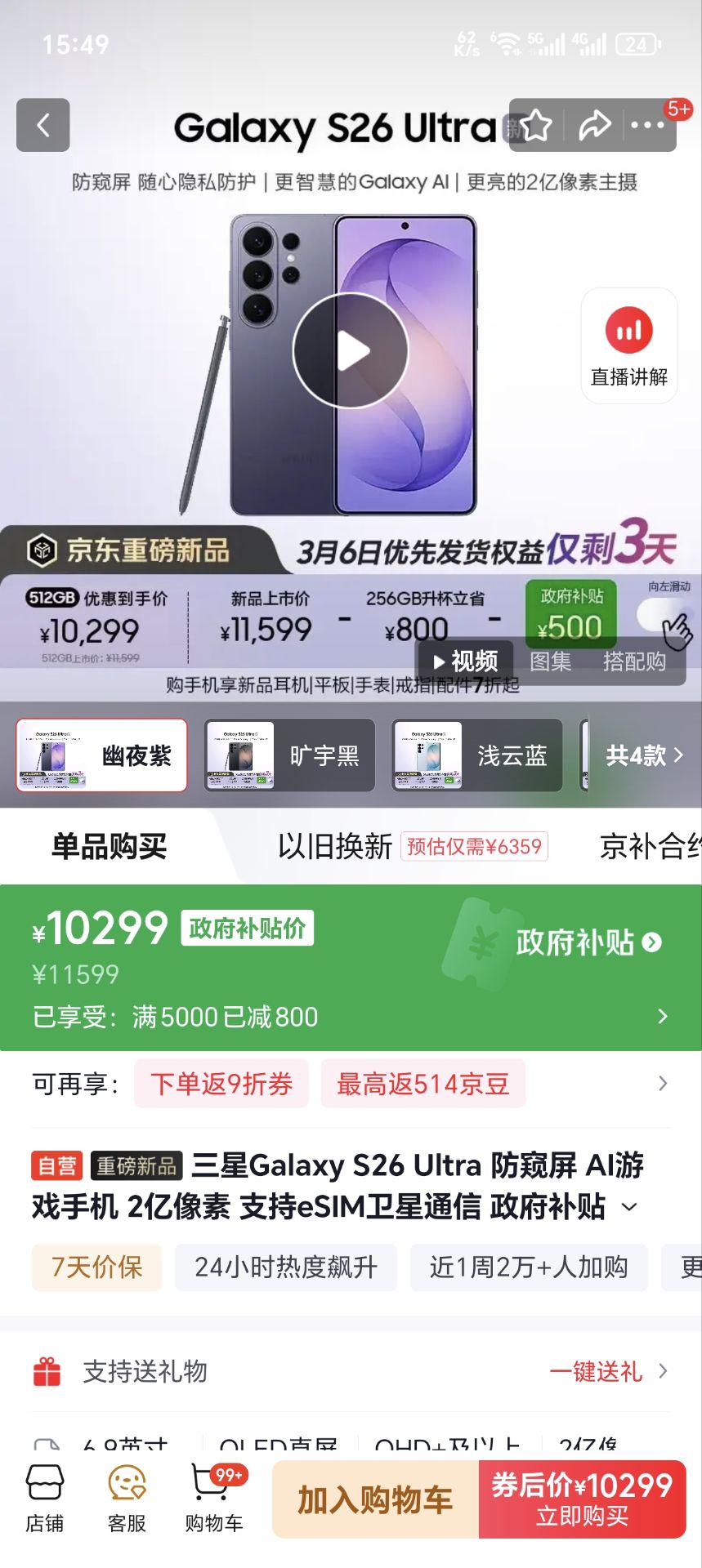 新品三星 S26 Ultra 防窥屏手机 256升杯 512 10299 好单发报员 2026年03月03日 15:50 0 举报 新品三星 S26 Ultra 防窥屏手机256升杯 512 10299https://u.jd.com/NgKlC1V 复制文案