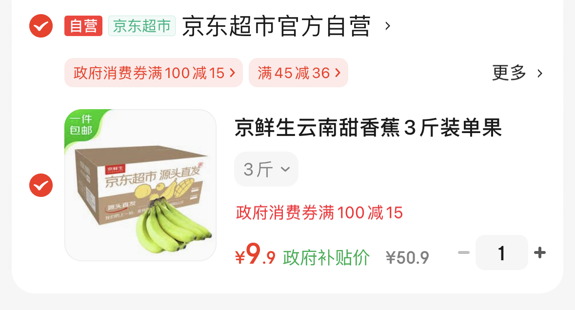 【自营包邮】京鲜生 云南甜香蕉 3斤