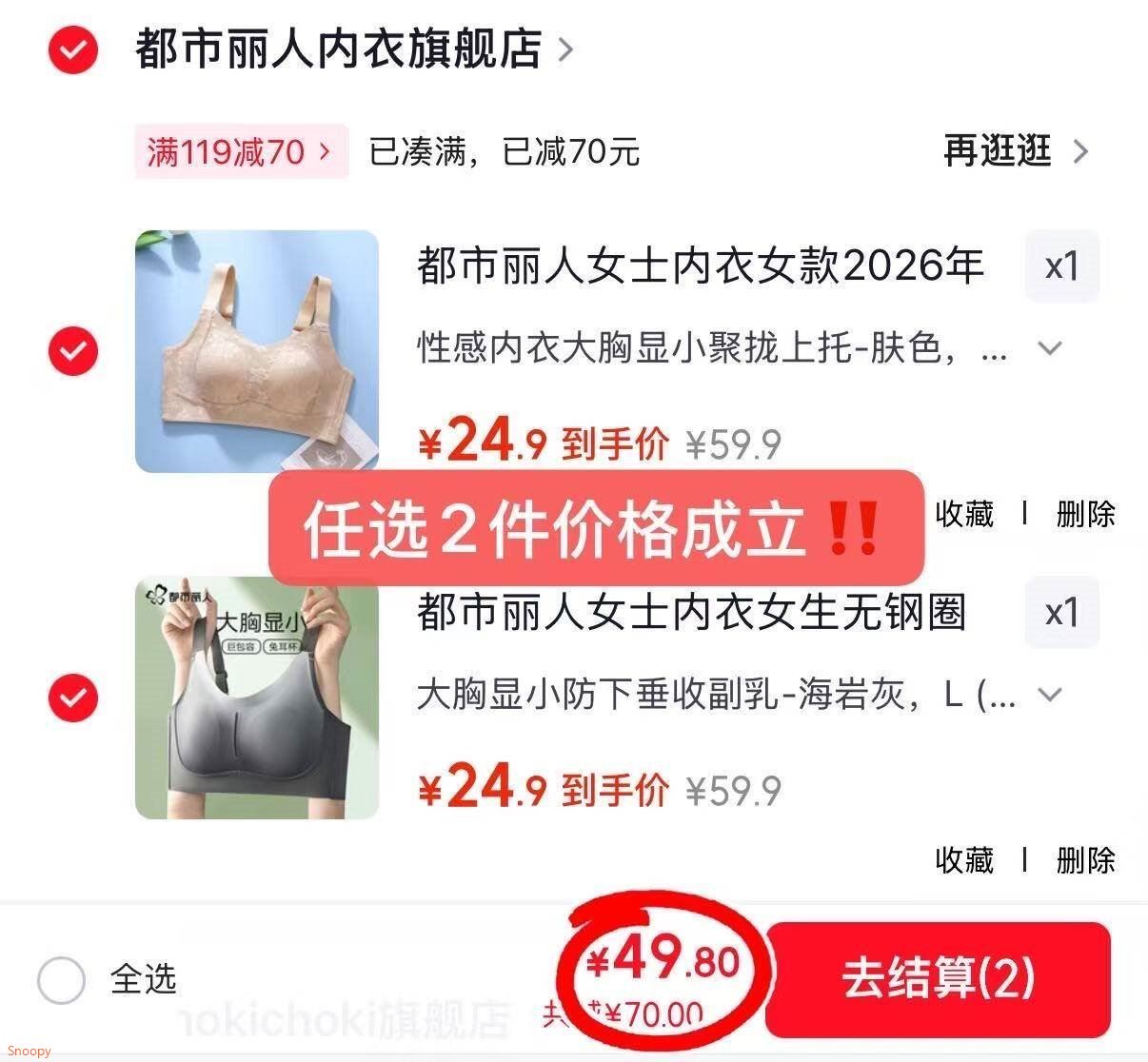 都市丽人女无痕聚拢文胸内衣 任选2件 49.8元好单发报员2026年04月04日 11:130举报 都市丽人 女无痕聚拢文胸内衣https://u.jd.com/caFvx9w https://u.jd.com/cOF200D 任选2件49.8元,折24.9元/件复制文案