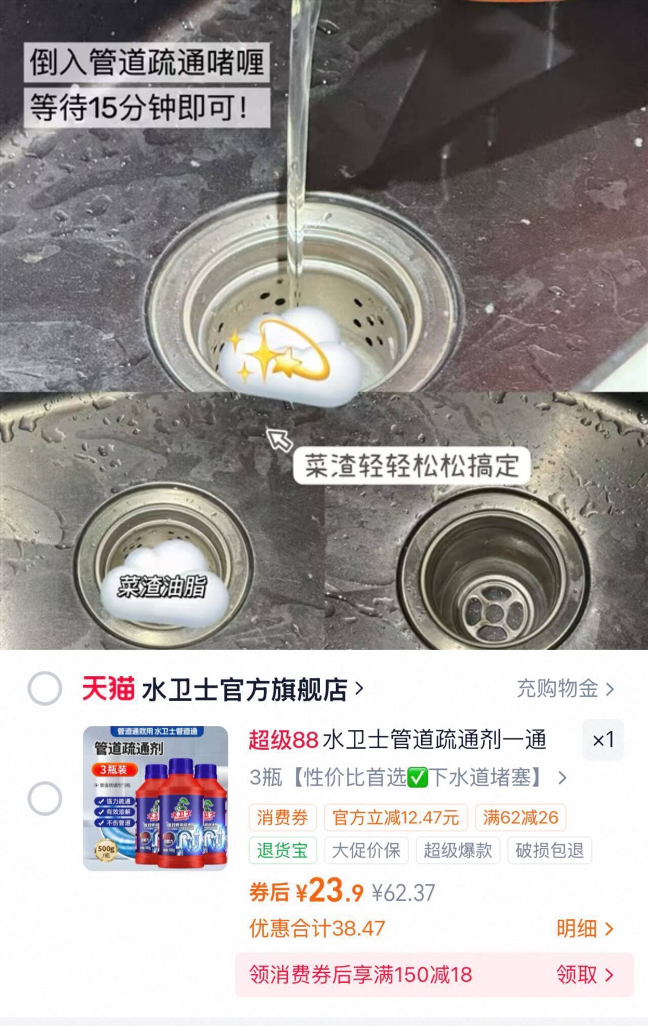 水卫士管道疏通剂3瓶23.9元,500g*3 7.9元/瓶发报员Z2026年04月07日 14:230举报 水卫士.管道疏通剂3瓶23.9元500g*3 7.9元/瓶!速度 油垢/头发/食物残渣都能溶解温和不伤管 3秒通下水道超牛https://m.tb.cn/h.ilBfX78复制文案