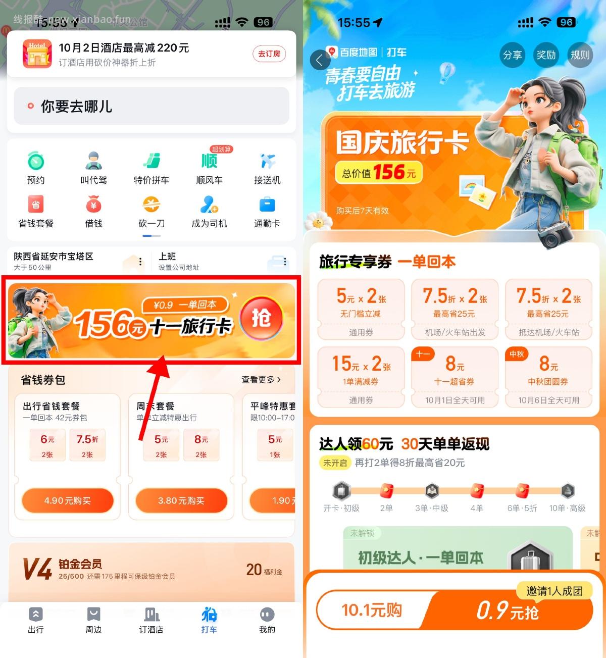 百度地图APP底部“打车”->点横幅进入活动->0.9亓拼团买国庆旅行卡