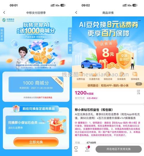 跳转到和包APP->直接领1000定向积分,可兑换钻石会员 包含50-8亓话费券