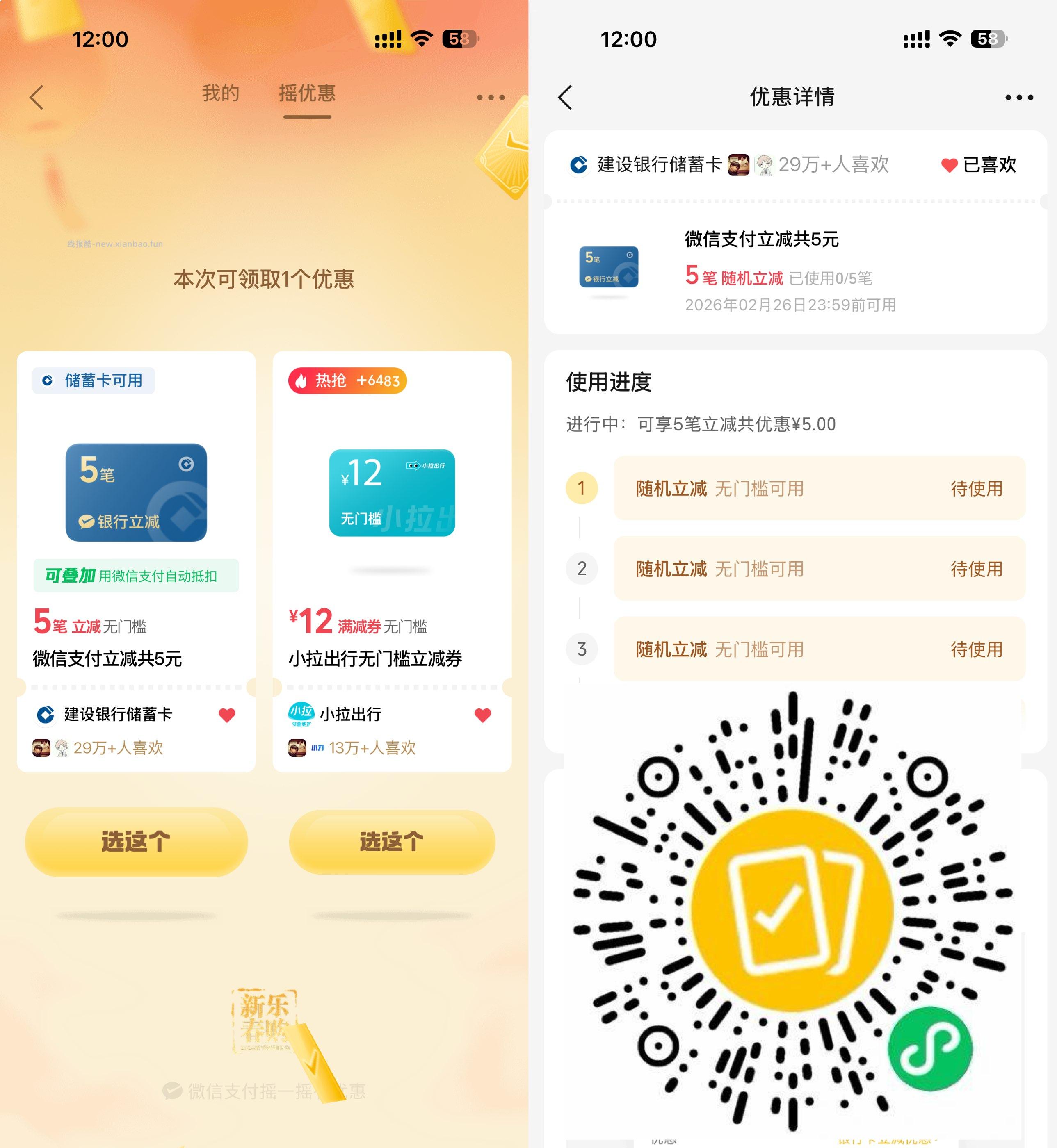 【微信支付抽多笔立减共可减5亓】